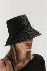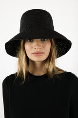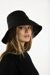 A natural straw bucket hat made for summer. This short-brimmed crochet bucket hat was intricately crocheted to create a flexible and structured design. This effortless bucket hat can easily be worn year-round and is meant for traveling with you wherever you go whether in a suitcase, a purse or a beach bag.