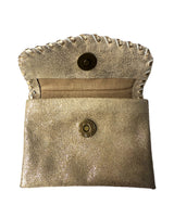 Artisan Handmade foldover coin pouch in gold shimmery leather.  Made with leather. Hand-stitched using leather strips creating beautiful whipstitch detailing.
