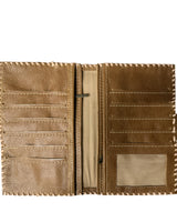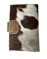 Artisan Handmade multi-pocket wallet. Made with cowhide hair on leather. Handstitched using leather strips creating beautiful whipstitch detailing. Large enough to hold your passport.