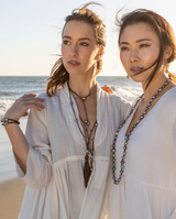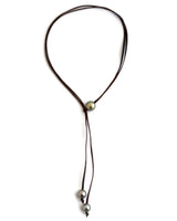 The Moana Necklace is part of the Raw Elegance Collection. Moana means ‘ocean’ in Tahitian and this necklace invokes the beautiful waters of French Polynesia where these lustrous pearls are from. Adorned with three 11-12mm Tahitian pearls strung on double wrapped hand rolled leather. A unique and stylish design with front clasp.