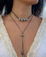 Adjustable length, can be worn as short as a choker and up to 20" length. 8-9mm Tahitian pearl clasp hangs elegantly down the back.