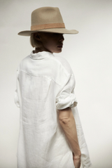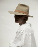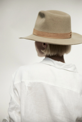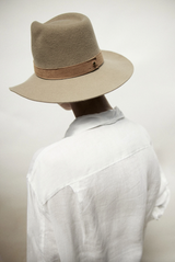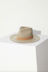 A timeless classic, Ross is crafted from 100% wool, featuring a tonal suede band and a signature gold logo screw closure. This bestselling fedora offers effortless packability, making it a versatile essential for any wardrobe. Its structured shape and understated design embody both sophistication and functionality.