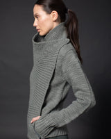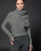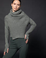 Easy chunky lounge cardigan, converts upside-down for cover-up cropped form. Thumbnails and side entry pockets in hems.