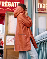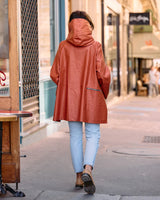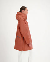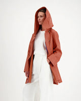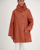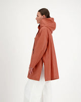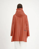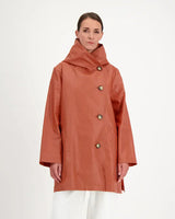 A hooded rain jacket with an artistic, minimalist feel. It features an asymmetrical front closure with oversized buttons, a softly structured hood, roomy patch-style side pockets, and an easy A-line silhouette that hits around mid-thigh.