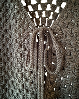 The Luna Kaftan is a meticulously hand-crocheted maxi kaftan dress featuring a stunning full moon design on the back.