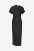 Short-sleeved maxi dress with a regular fit. Button and loop closure at the back and invisible zipper on the side. Fixed gathering at the side. Slit at the leg. Main material made from 100% recycled polyester. This product is GRS certified. Each stage of the supply chain has met strict social, environmental, and chemical requirements.