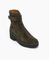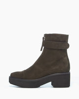 Designed with the elements in mind, the Eadrom Boot is a sleek, split suede leather ankle boot. The boot features a round toe, an operational front zipper, and a black leather strap around the ankle. Specifically elevated to keep you above the cold pavement in style. Front zip closure, with velcro strap.