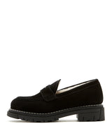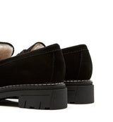 Lined with genuine shearling, this suede loafer features a lug sole, a classic penny slot detail, and elegant topstitching.