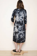 Raquel Allegra's Linnfield dress s a versatile, midi-length dress can be worn as a button-down or unbuttoned as a light jacket. Each piece is unique, no two are alike since the dye is allowed to bloom organically, forming the cloudy motifs. The result is a one-of-a-kind garment, with each resembling a different piece of the sky, from dark and stormy to dreamy and blue.