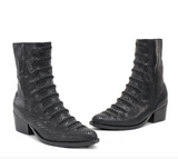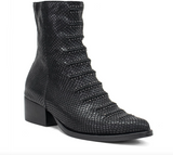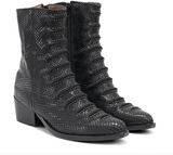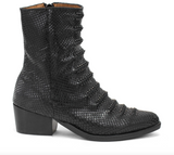 This is truly a CC classic! The Tiba Tall is handmade with all leather and leather lined upper. Padded Poron insole for extra comfort. Inside zipper, leather sole with welting and a sculpted wood heel. A unique design embellishes the front with studded nickel art.