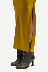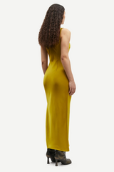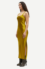 Slim fitting sleeveless midi dress with scooped front and back necklines. Darted bust and waist, hem slit. Bias cut 100% recycled polyester fabric with subtle sheen. This product is GRS certified. Each stage of the supply chain has met strict social, environmental, and chemical requirements.