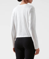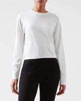 The Classic Jersey Long Sleeve Boy Tee is done in a luxe cotton jersey. It combines the weight and shape of a men's tee with the fit of a women's piece. It features a slightly cropped, boxy shape with longer and wider cut sleeves. The classic piece is updated with a black and white stripe print and white contrast collar.
