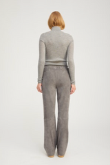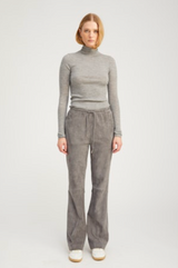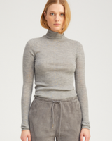 Finely knitted in our high quality, ultrasoft Mongolian Cashmere, this lightweight long sleeve essential will easily become a wardrobe favorite. Elegantly designed with playful lettuce hemlines, this vertical ribbed mock-neck has just the right amount of stretch, and is slightly fitted for a slimming look. With a wide range of styling options, this top tucks seamlessly into all of your high waisted bottoms making it the perfect layering piece to pair with your favorite SPRWMN jeans or trousers.