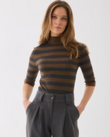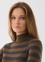 Merino Superfine Rib Knit Stripe Elbow Sleeve Turtleneck | Camel/Anthracite Chine