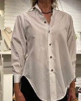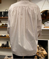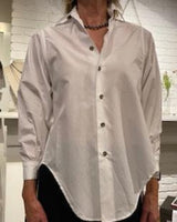 The Party in the Back is an oversized relaxed cotton button down with brown tortoise buttons, full length button sleeves, and pleating in the back for some extra flow. |