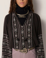 Cotton gauze blouse with generous sleeves, embroidered in rows of geometric stars and borders in chalk and silver-grey. The black base makes the stitchwork gleam softly, like frost against midnight.