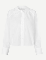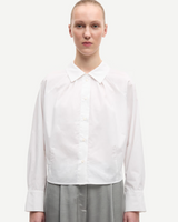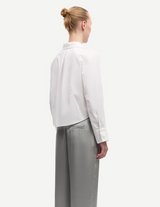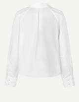 Long-sleeved shirt with a loose fit and curved sleeves. Button closure on the front and buttoned cuffs. Rounded hem. Draped detailing below the collar. Neck yoke seam. Main material made from 100% organic cotton. This product is GOTS certified. Each stage of the supply chain has met strict social, environmental, and chemical requirements.