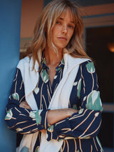 The Harper Dress is a vintage-inspired shirt dress with a tailored pleated waist, full-button front and elongating midi hemline. Featuring signature hidden side pockets and bracelet length sleeves, Trovata's most classic fitted shirt dress yet. Shown here in Jade Tulip and made from our viscose.