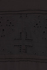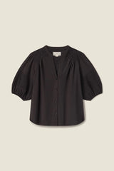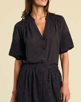 The Loren blouse is a short-puff sleeved blouse with a v-neck opening, buttoned front placket and delicate gathers at the front and back shoulders. Shown here in Black Handkerchief Eyelet and made from soft linen.