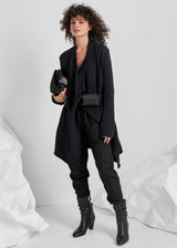 Our most popular style from Veronique Miljkovitch! 4 Jackets in 1! This fun wrap jacket can be worn 4 different ways! Drape the scarf around your neck, behind your head or simply leave it hanging. It's up to you to figure out the fourth way! Montana has a raw edge along the front, scarf, hem and sleeves.