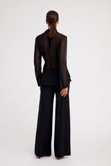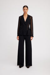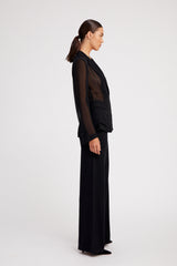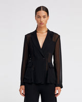 A classic, sheer, one button blazer made of breathable, luxurious silk chiffon. Featuring lined pockets and a back vent, this blazer is a clean and sleek option for any occasion. Layer over a fitted tank and denim or with our leather trousers.